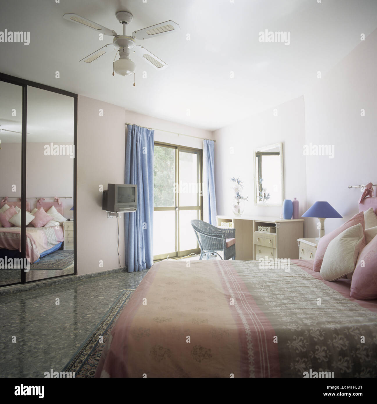 Camera Da Letto Con Una Ventola Sopra Un Letto Con Rosa E Blu E
